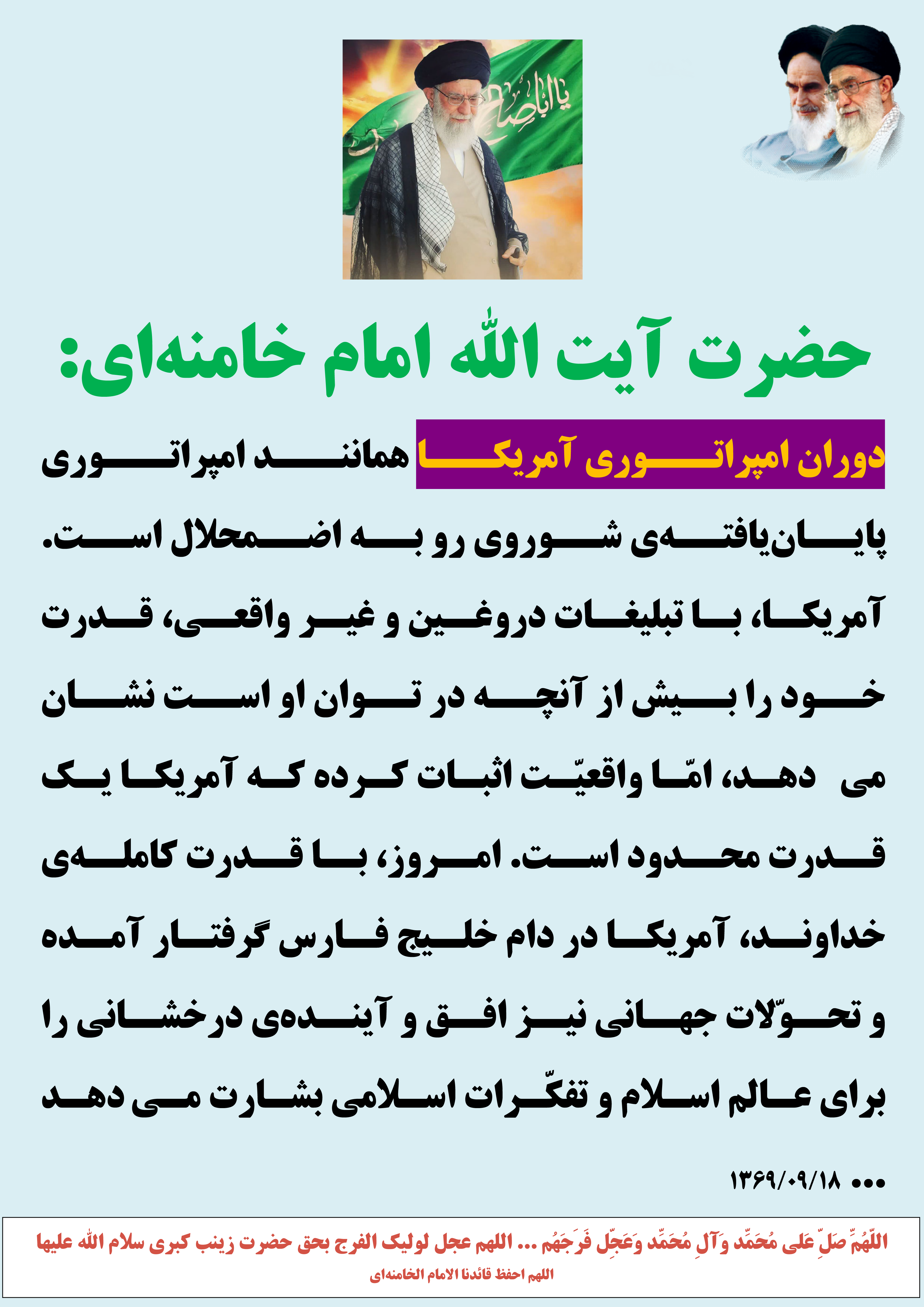 دوران امپراتوری آمریکا همانند امپراتوری پایانیافتهی شوروی رو به اضمحلال است. آمریکا، با تبلیغات دروغین و غیر واقعی، قدرت خود را بیش از آنچه در توان او است نشان میدهد، امّا واقعیّت اثبات کرده که آمریکا یک قدرت محدود است. امروز، با قدرت کاملهی خداوند، آمریکا در دام خلیج فارس گرفتار آمده و تحوّلات جهانی نیز افق و آیندهی درخشانی را برای عالم اسلام و تفکّرات اسلامی بشارت میدهد ... ۱۳۶۹/۰۹/۱۸