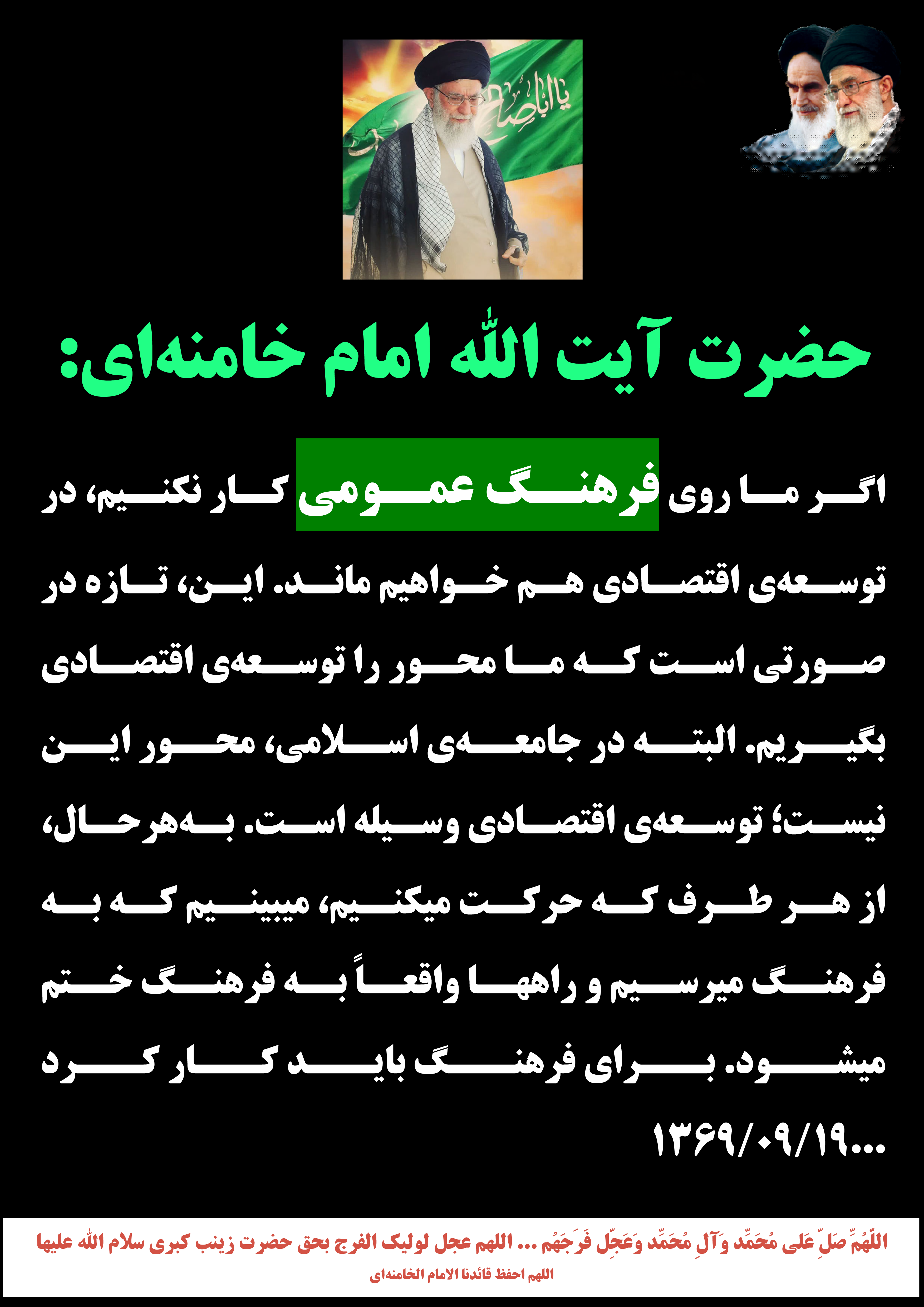 اگر ما روی فرهنگ عمومی کار نکنیم، در توسعهی اقتصادی هم خواهیم ماند. این، تازه در صورتی است که ما محور را توسعهی اقتصادی بگیریم. البته در جامعهی اسلامی، محور این نیست؛ توسعهی اقتصادی وسیله است. بههرحال، از هر طرف که حرکت میکنیم، میبینیم که به فرهنگ میرسیم و راهها واقعاً به فرهنگ ختم میشود. برای فرهنگ باید کار کرد ...۱۳۶۹/۰۹/۱۹