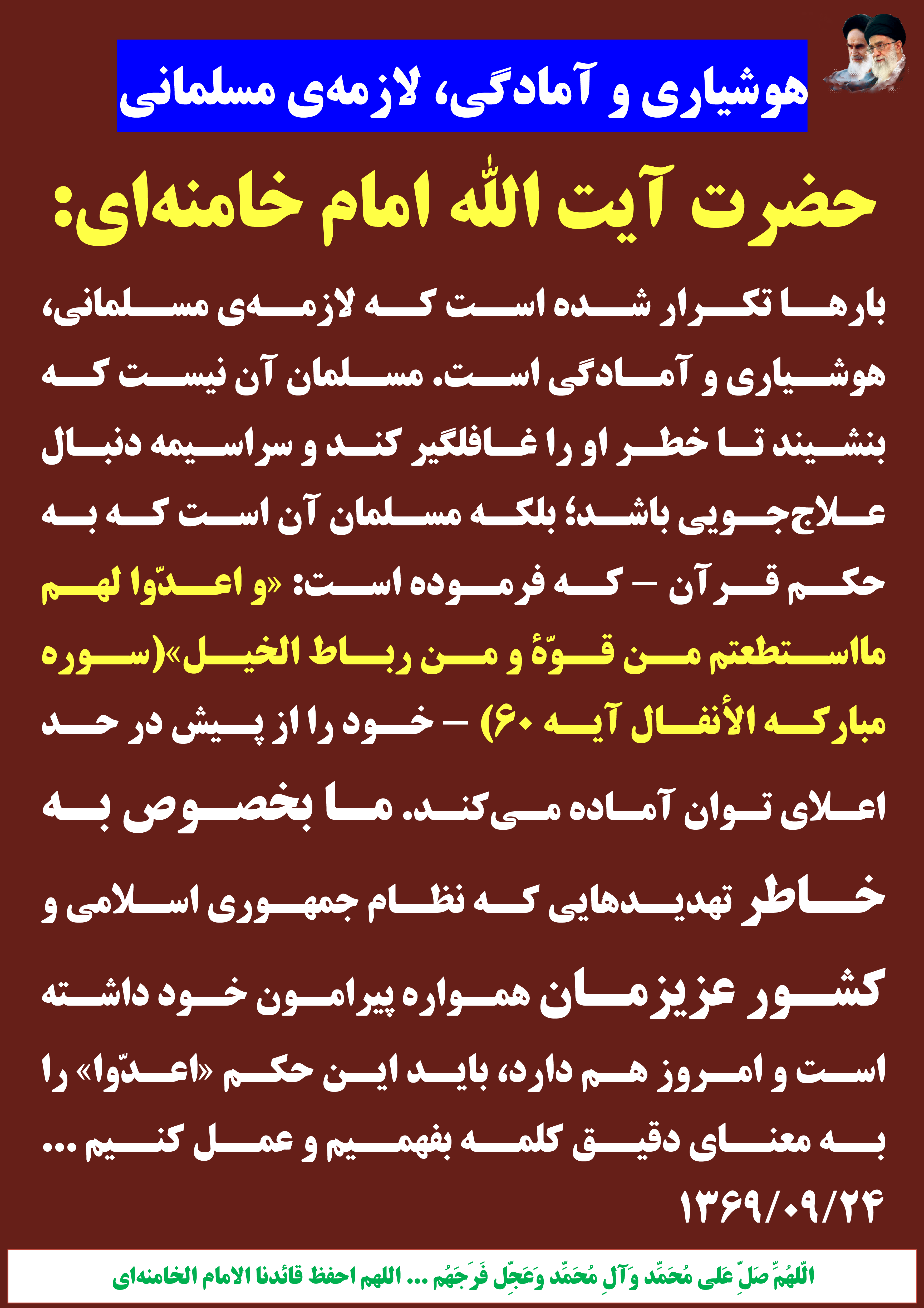 بارها تکرار شده است که لازمهی مسلمانی، هوشیاری و آمادگی است. مسلمان آن نیست که بنشیند تا خطر او را غافلگیر کند و سراسیمه دنبال علاججویی باشد؛ بلکه مسلمان آن است که به حکم قرآن - که فرموده است: «و اعدّوا لهم مااستطعتم من قوّة و من رباط الخیل»(سوره مبارکه الأنفال آیه ۶۰) - خود را از پیش در حد اعلای توان آماده میکند. ما بخصوص به خاطر تهدیدهایی که نظام جمهوری اسلامی و کشور عزیزمان همواره پیرامون خود داشته است و امروز هم دارد، باید این حکم «اعدّوا» را به معنای دقیق کلمه بفهمیم و عمل کنیم ... ۱۳۶۹/۰۹/۲۴
