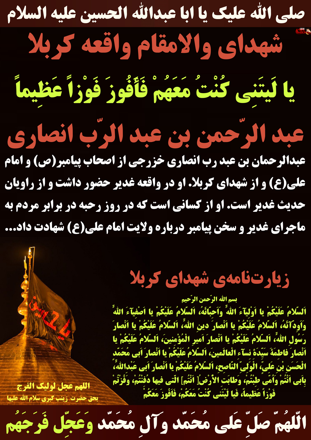 عبدالرحمان بن عبد رب انصاری خزرجی از اصحاب پیامبر(ص) و امام علی(ع) و از شهدای کربلا. او در واقعه غدیر حضور داشت و از راویان حدیث غدیر است. او از کسانی است که در روز رحبه در برابر مردم به ماجرای غدیر و سخن پیامبر درباره ولایت امام علی(ع) شهادت داد...