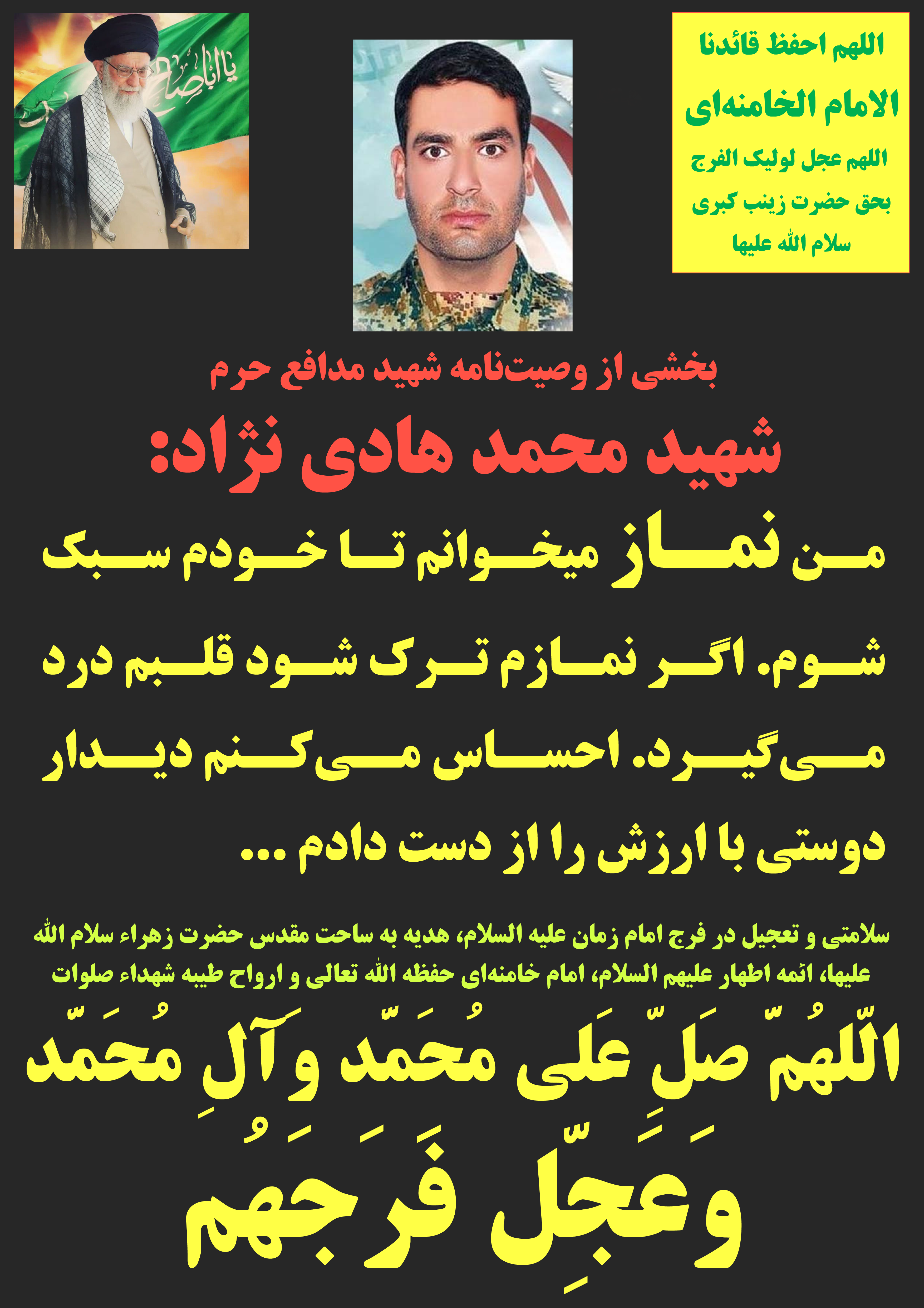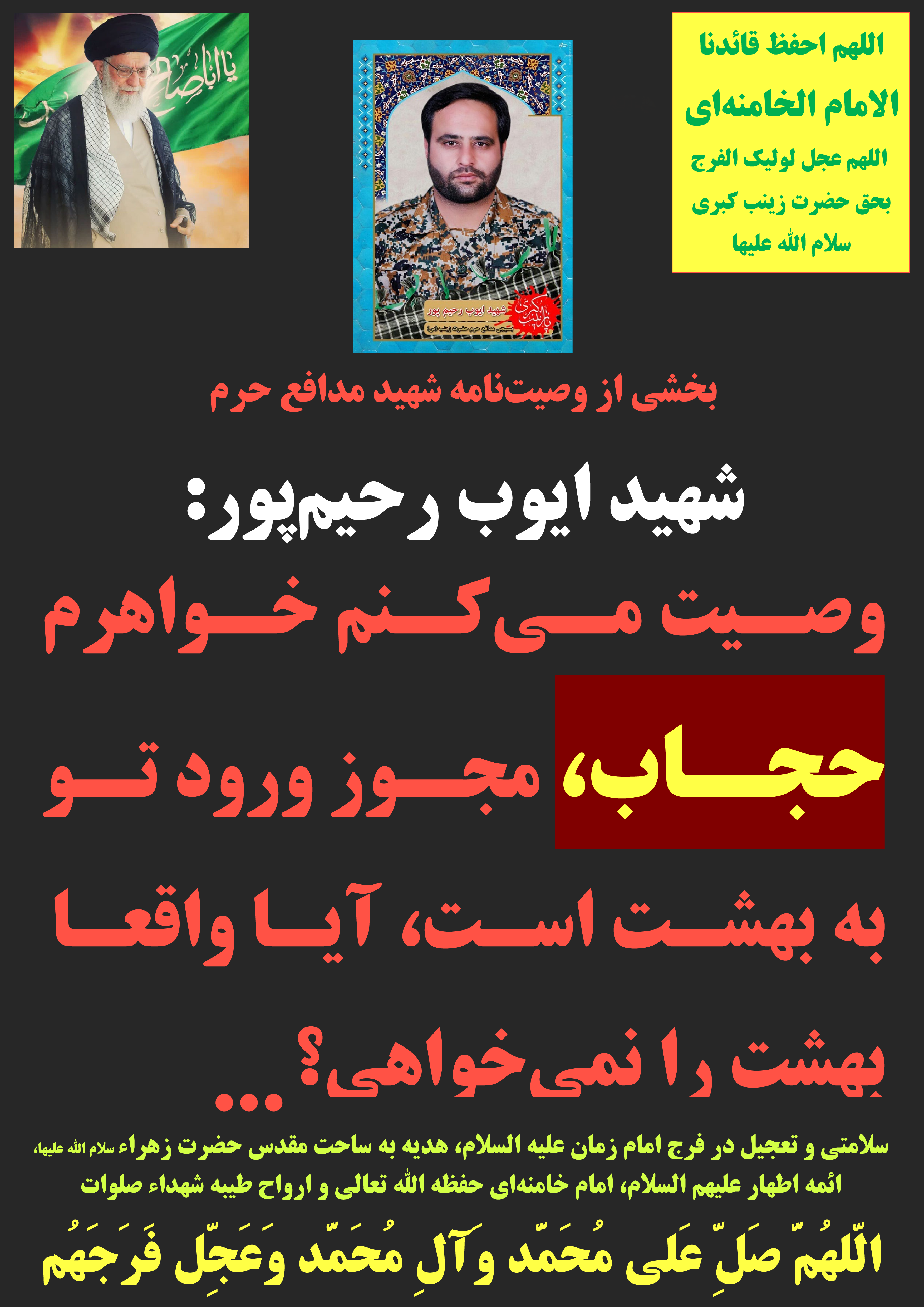 نماز و حجاب از جمله مسائلی است که همواره مورد تاکید شهدا بوده است. شهیدان مدافعان حرم «ایوب رحیمپور»، «محمد هادینژاد» و «علی اکبر شیرعلی» نیز در وصیت نامه خود اطرافیان را به رعایت حجاب و اقامه نماز دعوت کرده اند ...