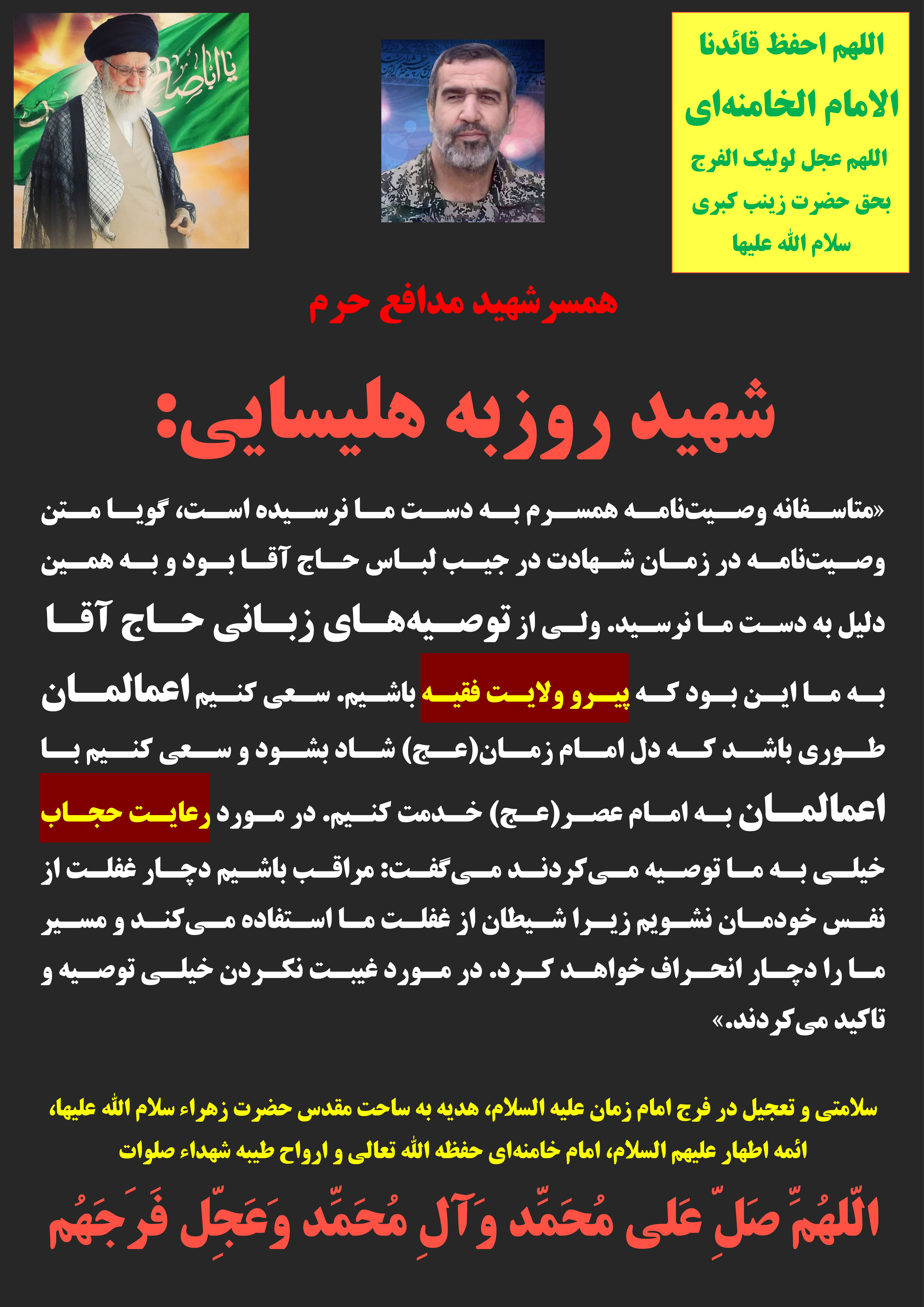 «متاسفانه وصیتنامه همسرم به دست ما نرسیده است، گویا متن وصیتنامه در زمان شهادت در جیب لباس حاج آقا بود و به همین دلیل به دست ما نرسید. ولی از توصیههای زبانی حاج آقا به ما این بود که پیرو ولایت فقیه باشیم. سعی کنیم اعمالمان طوری باشد که دل امام زمان(عج) شاد بشود و سعی کنیم با اعمالمان به امام عصر(عج) خدمت کنیم. در مورد رعایت حجاب خیلی به ما توصیه میکردند میگفت: مراقب باشیم دچار غفلت از نفس خودمان نشویم زیرا شیطان از غفلت ما استفاده میکند و مسیر ما را دچار انحراف خواهد کرد. در مورد غیبت نکردن خیلی توصیه و تاکید میکردند.»